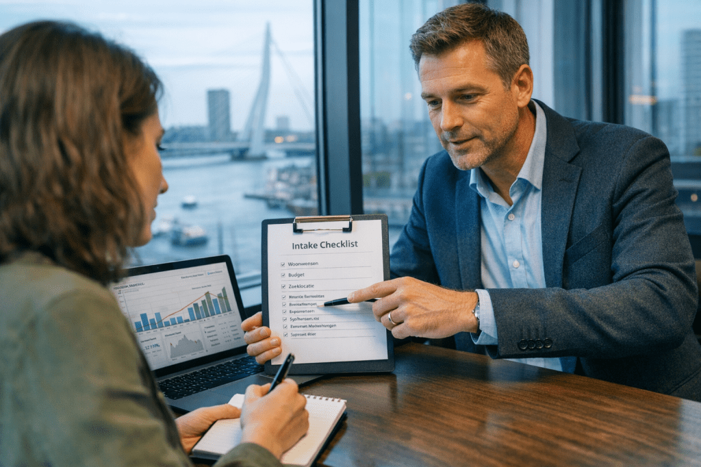 Het intakegesprek is jouw kans om te ontdekken of een aankoopmakelaar écht bij je past. Vraag allereerst naar hun onderhandelstrategie: hoe pakken ze overbiedingen aan en welke marktkennis hebben ze specifiek over jouw doelwijken in Rotterdam? Peil ook hun beschikbaarheid — in deze snelle markt wil je weten hoe snel ze kunnen reageren op nieuwe woningen en of ze flexibel zijn met bezichtigingen. Tot slot is hun netwerk cruciaal: een goede makelaar heeft korte lijntjes met betrouwbare hypotheekadviseurs, taxateurs en bouwkundigen, wat het hele aankoopproces aanzienlijk versnelt.